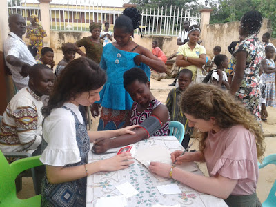Elaine, one of the medical students, checking the blood pressure of a church member. Ernest, in multi-colored shirt, documenting blood sugar readings